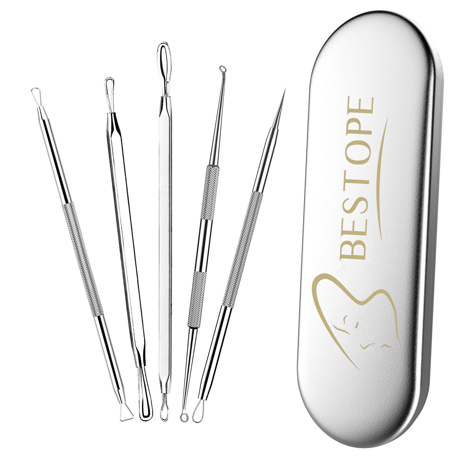 BESTOPE Juego de 5Pcs Blackhead Remover Dermatologist Grade Kit - acero inoxidable limpiador acné espinilla Pin Spot Extractor aguja Personal belleza cuidado herramienta plata - mit metall box