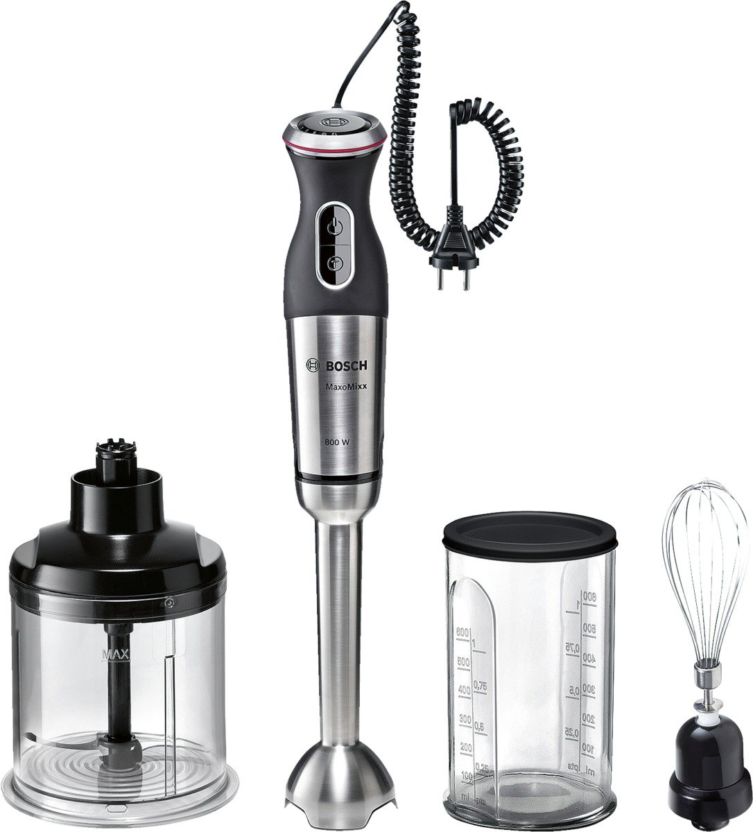Bosch MaxoMixx MSM88160 - Batidora de mano, 800 W, regulador electrónico de velocidad, cúpula con cuatro cuchillas, con picador y varilla batidora, color negro y gris